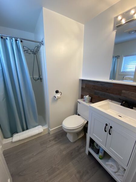 - Bathroom – standing shower, toilet and sink. Two rolls of toilet paper and hand soap are provided.