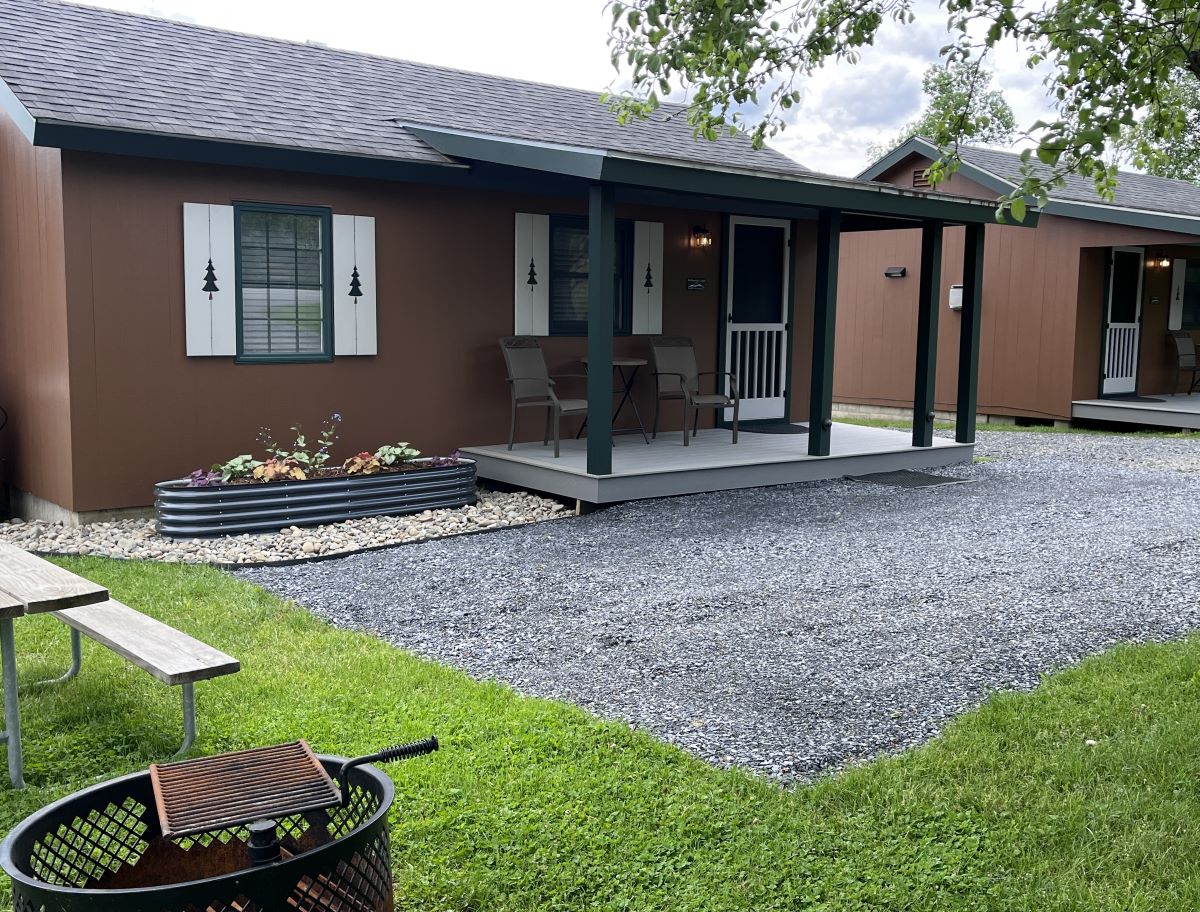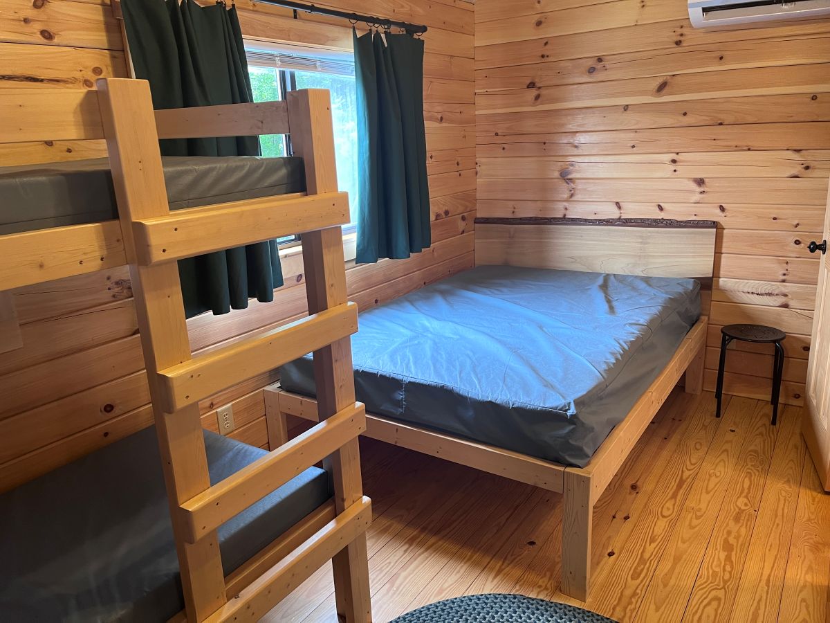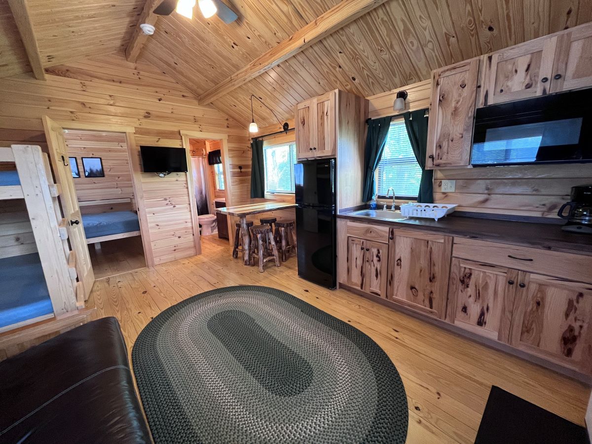 The 13×25′ One Bedroom Log Camping Cabin sleeps up to 6 people (max 4 adults). Rate based on 2 adults & 2 children 17 and under, see additional guest fees below. One bedroom with a queen bed, plus a bunk bed and double futon in the living area. There is a private bathroom with standing shower and a partial kitchen with a fridge, sink, microwave, coffee maker and table seating for 4. Camp in comfort with heat & A/C and a television (OTA channels and wifi). Enjoy the outside space that includes a covered front porch, chairs, a patio with picnic table, fire ring and a gas grill (w/ side burner) for cooking meals outside. Linens & towels, kitchen utensils, dishes and cookware are NOT provided, bring your own. Cabin is located at site #212.